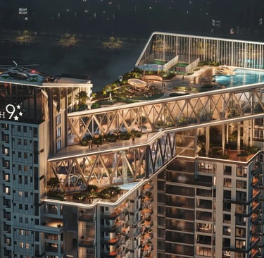 Rise With 9 is designed as iconic twin high-rise towers (reported ~55–56 floors), sky-bridges and staggered podiums — a form factor that becomes a neighbourhood landmark. Landmark towers deliver two practical benefits: (a) aspirational branding that supports premium pricing and (b) superior skyline / lake views for upper floors — both important for resale and premium rentals. The Trilight Neopolis - Rise with 9+1